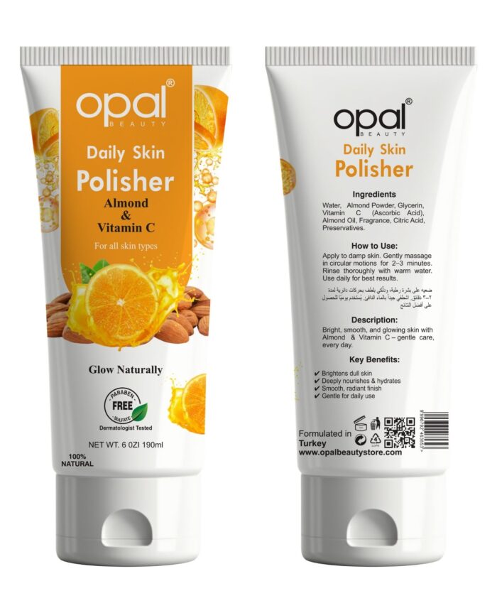 Daily Skin Polisher Almond & Vitamin C is a gentle exfoliating formula that removes dead skin cells and impurities for a fresh, radiant look. Enriched with nourishing almond and brightening vitamin C, it helps improve skin texture, reduce dullness, and reveal a natural healthy glow. With regular use, your skin feels smooth, soft, and revitalized. Available at Opal Beauty.