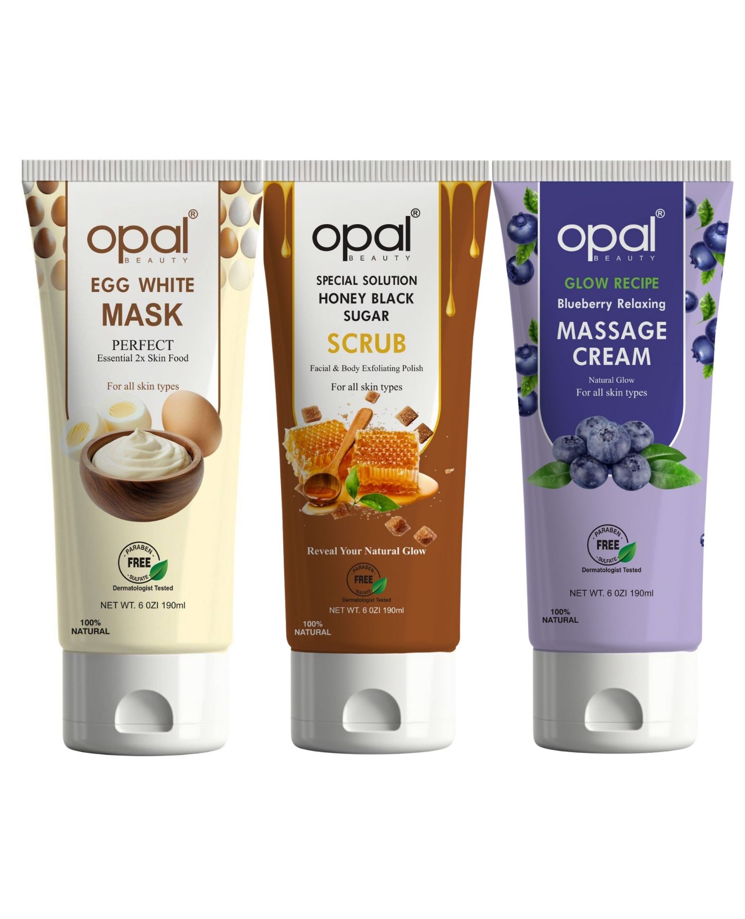 Transform your skincare routine with the Shine On Kit by Opal Beauty, the perfect trio for achieving a spa-like glow at home. This comprehensive bundle includes the Honey Black Sugar Scrub, which gently exfoliates to polish away impurities and smooth your skin texture. It is paired with the Egg White Mask, a powerful formula that acts as essential skin food to tighten pores and rejuvenate your complexion. Complete the treatment with the Blueberry Relaxing Massage Cream, designed to soothe and hydrate for a lasting, natural radiance. 100% natural, paraben-free, and dermatologist-tested, this kit is safe and effective for all skin types.