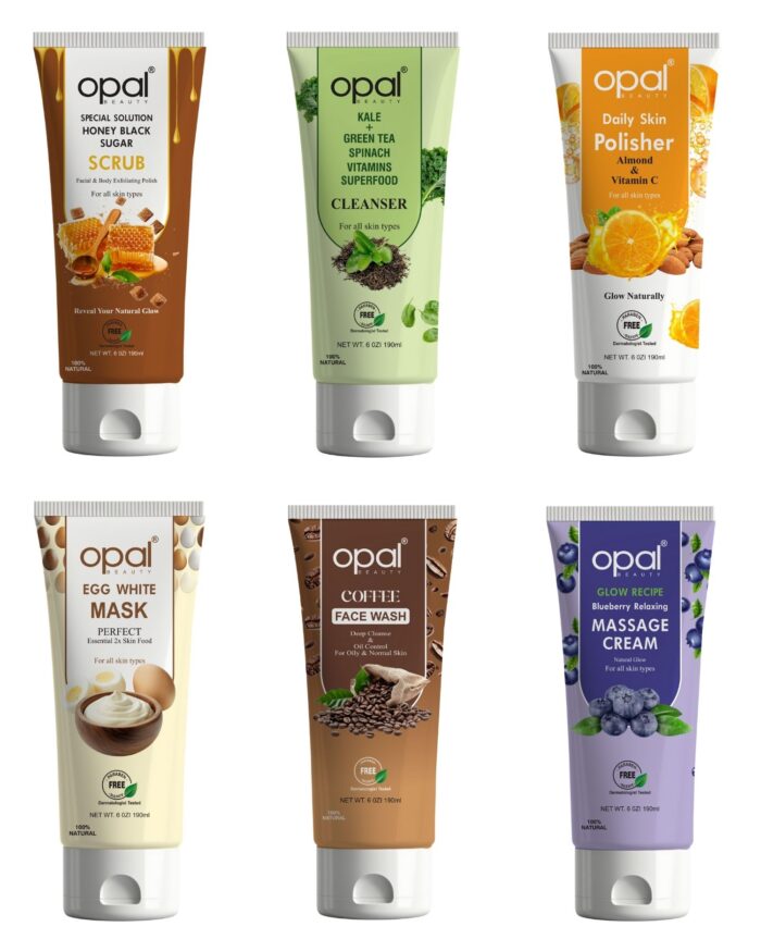 It includes Coffee Face Wash, Kale + Green Tea Spinach Cleanser, Blueberry Relaxing Massage Cream, Honey Black Sugar Scrub, Daily Skin Polisher, and Egg White Mask for complete care.